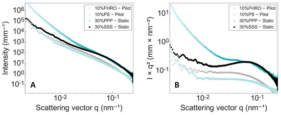 Figure 2A presents the USAXS profiles obtained before thixotropy measurement. These profiles allow one to understand the length scale of each component, as well as to differentiate the base behavior of each sample. From Figure 2, significant structural disparities can be revealed. The higher intensity observed for the 30% SSS and 30% PPP samples is expected, as it is derived from the greater solid fat content (30% vs. 10% on the pilot scale). Additionally, from the Kratky plot (Figure 2B), it is possible to observe that the CNP bump is located at a similar range in all samples. Smaller deviations are visible for the 30% SSS sample, portraying a bump at higher q-values, indicative of a smaller cross-section. This result is confirmed in Table 2, as the cross-section of all samples seems to be relatively similar, with 30% SSS reporting the smallest value. The corresponding fits are available in Appendix C. In all cases, the CNP thickness and width remain below 150 nm.