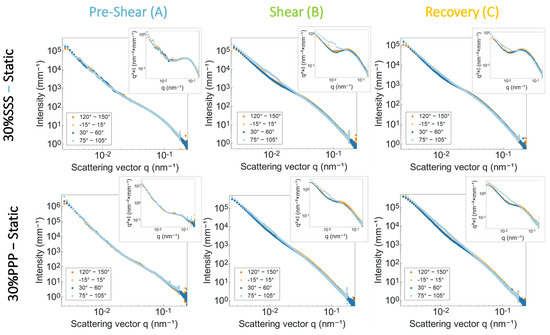 Azimuthally averaged intensity USAXS profiles for statically crystallized samples. The top panel shows results for 30% SSS, while the bottom panel shows results for 30% PPP. The data are integrated over specific angular ranges, [−15°; 15°], [30°; 60°], [75°; 105°] and [120°; 150°], represented by the respective 1D curves. These profiles were here used to identify orientation within the sample. Each figure is accompanied by an insert, which presents the Kratky representation of the same data.