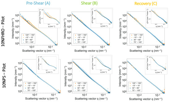 In contrast, orientation is already visible in the initial interval for the pilot scale data (Figure 4, more clearly visible in the Kratky plot). We hypothesize that the CNP network was already altered during the placement of the sample in the shear cell, and as a result, orientation is visible in all stages of the process, achieving maximum deviation in the shear stage (see Kratky plots). Concurring with the static observations, all deviations occur at lower q-values, suggesting that the orientation cannot be associated with the CNP cross-section.