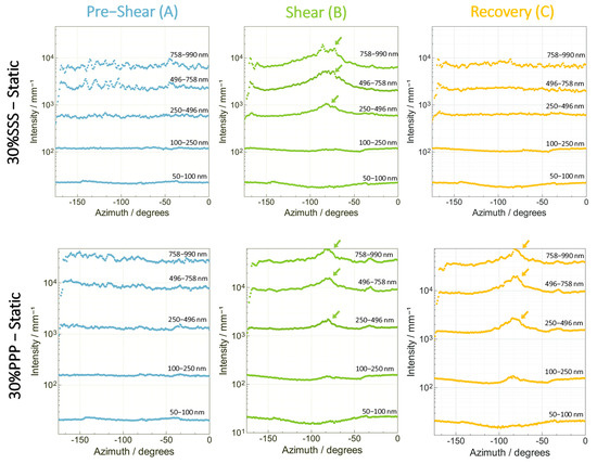 Based on Figure 5, we can conclude that statically crystallized samples exhibit minimal orientation at rest. Upon shear application, a clear trend emerges: a peak becomes evident at around −90° at length scales greater than 250 nm. This peak progressively increases at increasing dimensions. For the 30% SSS sample, upon relaxation, the intensity of the orientation pattern diminishes, indicating a partial reduction of the aligned structures. This is not the case for the 30% PPP sample, in which structures above 250 nm remain oriented after shear cessation.