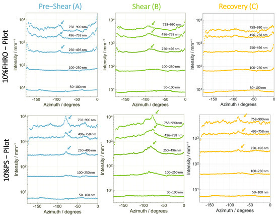 To better understand which real-space dimension is effectively oriented, five azimuthal profiles were integrated, namely, [50 nm; 100 nm], [100 nm; 251 nm], [251 nm; 496 nm], [496 nm; 758 nm] and [758 nm; 990 nm], at each thixotropy interval (pre-shear, shear and recovery). This integration involves selectively integrating the scattering intensity within a limited q-range. By narrowing down the integration to this q-crown, specific length scales can be isolated, and it is possible to focus on the scattering contributions from particular structural elements (i.e., CNPs, CNP aggregates). Whenever a peak is visible on the resulting curves, orientation is confirmed. In contrast, whenever the scattering profile shows no clear anisotropy, a flat curve is obtained, hence allowing the identification of domain orientation upon shearing. The results are presented in Figure 5 and Figure 6. An arrow is used to identify orientation peaks.