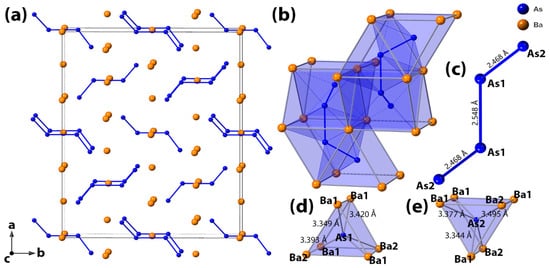 Ba3As4 and Ba5As4 structures are noticeably different. Half of the arsenic atoms in the latter dimerize, forming a homoatomic [As2]4− dumbbell with an As1–As1 distance of ca. 2.55 Å (Figure 3). This is slightly longer than the doubled covalent radius of arsenic (2.38 Å) and in the compositionally similar Zintl arsenides, such as K5As4 (2.45 Å) [8,52], but is comparable to the reported As–As bond length for isostructural analogs, such as Eu5As4 (2.54 Å) [46].