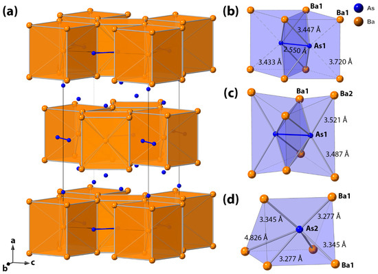 (a) A representation of the Ba5As4 structure, with slabs made of [BaBa8] cubes, and the outlined unit cell. As–As dimers are located between the cubes; (b,c) the trigonal prismatic arrangements of As-centered [AsBa6] polyhedra encasing the [As2]4− anions; (d) a representation of As2-centered distorted trigonal prisms of Ba atoms. The color code is the same as in Figure 1.