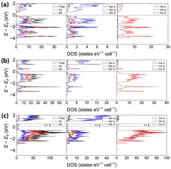 Barium and arsenic have a moderate electronegativity difference (with Pauling electronegativities of 0.89 and 2.18, respectively) [61], which supports the expectation of a sizable charge transfer and, therefore, semiconducting behavior. The latter suggestion is supported by the Zintl concept rationalization of the charge balance, discussed in the previous section. The results of the electronic structure calculations, presented in Figure 5, Figure 6 and Figure 7, corroborate well with the predicted charge-balanced nature of the title compounds and provide further insights into chemical bonding within these compounds.