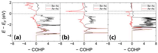 Calculated Crystal Orbital Hamilton plots (COHP) for (a) Ba3As4, (b) Ba5As4, and (c) Ba16As11. The Fermi level is the energy reference at 0 eV. An additional dashed line at ca. 0.48 eV indicates a 1-electron shift per formula unit.