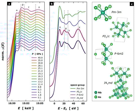 The theoretical XANES spectra calculated for the four crystal structures of NbAs are presented in Figure 2b. These structural models comprised the tetragonal already observed at room conditions and the predicted high-pressure phases, including the hexagonal , the monoclinic , and the cubic structures [26] (see Figure 2c), as summarized in Table S1. From the comparison between the theoretical and experimental XANES spectra, it is evident that both tetragonal and hexagonal phases closely resemble the experimental data, as all the XANES features (α, β, γ, and δ) can be accurately reproduced. This is not the case for both monoclinic and cubic phases, which exhibited significant spectral changes and an increased number of spectral features. We note that the simulated XANES spectra of the hexagonal exhibit a more enhanced γ feature compared to the tetragonal phase. It can be therefore used as an indicator for the phase transition previously observed from XRD [27]. Indeed, with increasing pressure, this feature intensifies also in the experimental data above ~25 GPa.