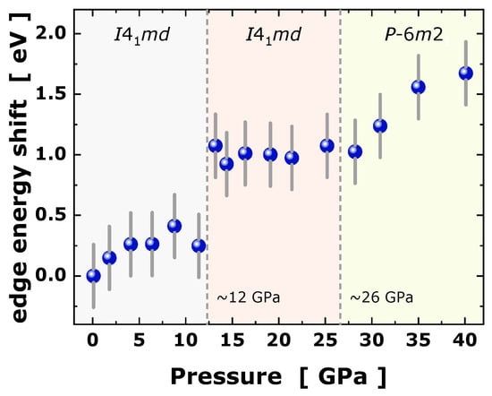 In Figure 3, the pressure dependency of the edge energy shift [, = ~0.1 GPa] is shown. The edge position was extracted from the first maximum of the XANES first derivative and compared to the position at ~0.1 GPa []. The edge energy distinctly shifted toward higher energies under compression, displaying an almost linear trend until ~12 GPa. Between ~12 and ~13 GPa, a clear discontinuity in the pressure evolution of the edge energy shift is apparent. Above this pressure, the edge energy shift stagnates up to ~26 GPa before it increases again up to the maximum probed pressure of ~40 GPa.