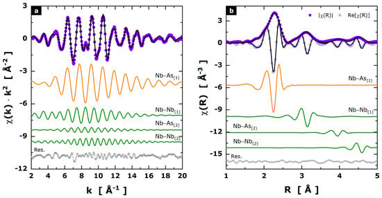 EXAFS data were fitted using the Artemis software [37]. For this purpose, the theoretical scattering paths for the tetragonal phase of niobium arsenide within the space-group [38] were calculated using FEFF software [39]. Our local structural model for NbAs comprised four single scattering paths: Nb–As(1) (~2.63 Å, CN = 6), Nb–Nb(1) (~3.47 Å, CN = 8), Nb–As(2) (~4.36 Å, CN = 4), and Nb–Nb(2) (~4.87 Å, CN = 8). Here, CN stands for the coordination number or coordination environment. A diagram of these single scattering paths is shown in Figure S1. The pair Nb–As(1) forms a trigonal prismatic [NbAs6] unit, which serves as the building blocks of the NbAs crystal structures [38]. The backscattering amplitude [] and phase [] for individual paths calculated using FEFF are shown in Figure S2. For the hexagonal high-pressure phase of NbAs, the same paths Nb–As(1), Nb–Nb(1), Nb–As(2), and Nb–Nb(2) having the same coordination number and similar distances can be employed. As will be discussed later, a high-pressure phase with a hexagonal unit-cell is observed for NbAs. We tested the EXAFS fitting using both phases, and the results are quite similar. This occurs because both and are quite identical for the tetragonal and hexagonal phases. For the fitting procedure, the Fourier transforms (FT) of -weighted EXAFS functions were performed using a Hanning-type window. The window size was set in - and -spaces to the ranges of = 3.5−19.5 Å−1 and = 1.5−5.0 Å, respectively. Fitting parameters included the mean pair distances () and their variances (), while the coordination numbers were kept as fixed parameters [40]. The amplitude reduction factor ( 1.05) was deduced from the fit of a Nb foil EXAFS spectrum measured during the same experiment.