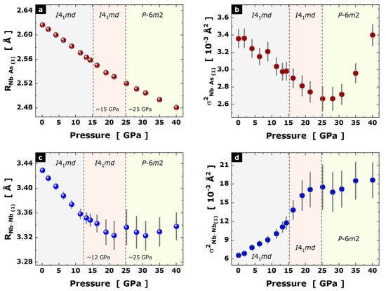 The mean pair distances () and their variances () for the paths Nb–As(1) and Nb–Nb(1) are shown in Figure 6. As can be seen in Figure 6a, the bond distance Nb–As(1) reduces by ~5.2% during the compression from 0.1 to 40 GPa. We noticed a subtle change in the evolution of the bond compressibility above ~15 GPa and 25 GPa. Interestingly, the pressure evolution of mean distance for the path Nb–Nb(1) also exhibits changes in the slope above ~12 GPa and 25 GPa (Figure 6c). In Figure 6b, the pressure evolution of the variances () of the Nb–As(1) bond can be recognized. It displays a constant decrease until ~25 GPa and an increase above this pressure. In contrast to the Nb–As(1) bond, the distance variance of the Nb–Nb(1) bond increased monotonically until ~15 GPa, as shown in Figure 6d. Above this pressure, it increases rapidly up to ~25 GPa and then remains almost constant until ~40 GPa. We noticed an increase in error bars for the path Nb–Nb(1) parameters above ~15 GPa, which is possibly related to the decreasing signal strength with pressure, as shown in Figure 5b.