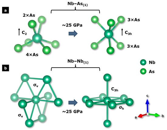 Notably, the coordination numbers equal to six and eight for paths Nb–As(1) and Nb–Nb(1), respectively, were maintained across the phase transition, as shown in Figure 7. However, changes in bonding topology due to the transition of the trigonal prismatic [NbAs6] units can be recognized. For instance, the spatial arrangements of the Nb–As bond were altered from [4 × As ⊕ 2 × As] to [3 × As ⊕ 3 × As], as shown in panel (a). In this sense, pressure initially confines the Nb–As vibration (hardening effect) and, subsequently, induces a change at ~25 GPa in the bond topology, leading to an increase in . Near pressure-induced structural transitions, indeed, typical anomalies in pair-distance variance may occur in several compounds, as, for example, in YH3 [57], CuO [58], and La1/3NbO3 [59]. For the pair Nb–Nb(1) in Figure 7b, it is noteworthy that the formation of both the axis and horizontal mirror () continuously alters the vibrational patterns, which may explain the increase in the value of above ~25 GPa.
