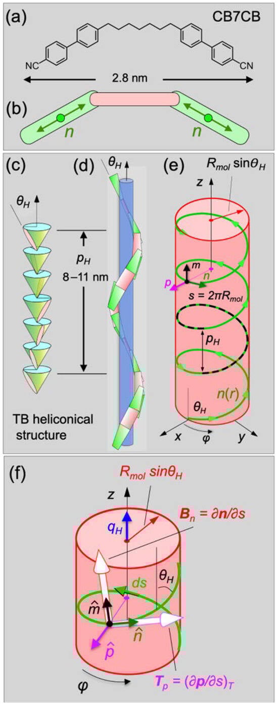The most recent, and perhaps most exotic, manifestation of spontaneous chirality in a fluid of achiral molecules is the twist-bend (TB) liquid crystal phase formed of bent molecular dimers, like CB7CB (Figure 1a), which fills 3D space with a long-range ordered, 1D heliconical precession of pure molecular orientation, sketched in Figure 1b–e. Initially proposed as a theoretical possibility [11,12,13], the TB phase has been realized [14,15] and intensively studied in a number of systems of bent molecules [15,16,17,18,19,20,21,22,23,24,25]. This activity has featured TB applications development, including fast electro-optic switching in the TB phase [26] and pretransitional TB clustering, enabling the spectacular tunability of the heliconical nematic helix in TB systems with chiral doping, a significant advance over existing chiral nematic technologies [27,28].
