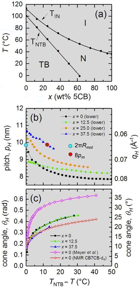 Figure 2. (a) Phase diagram of the CB7CB/5CB mixtures vs. weight %, x, and temperature, T, exhibiting isotropic (I), nematic (N), and twist-bend (also termed heliconical) nematic (TB) phases. (b,c) Helix pitch, pH, obtained by resonant soft X-ray scattering (RSoXS), and optical cone angle, θH, determined from birefringence measurements, of the heliconical structure in the TB phase vs. x and TNTBT, where TNTB is the N–TB phase transition temperature. Birefringence [45] and NMR data [46] from literature sources are also included. In CB7CB, the helix pitch near the transition is found to be pH ≈ 2πRmol (blue dot in (b)), where Rmol is the bend radius of curvature of an extended CB7CB molecule. Diffuse, non-resonant X-ray scattering indicates periodic segmentation along the helix of spacing pm ≈ 1.25 nm. The pitch near the transition has eight such segments (red dot in (b)).