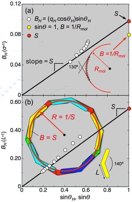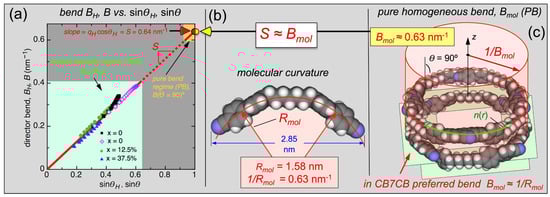 Figure 7. B(θH) vs. sinθH, analogous to those of Figure 3a, obtained in various ways for two statistical mechanical model systems of interacting bent particles. The black lines are drawn to match the measured bend at the smallest θH. (a) Monte Carlo simulation of TB ordering of steric particles made by rigidly chaining 11 hard spheres in the form of circular arcs [61]. The length scale is the sphere diameter, σ. The molecular curvature construction of Figure 3b is also sketched, giving a molecular bend Bm = 1/Rmol = (2π·50)/(360·11) = 0.079/σ, plotted as the yellow dot at θ = 90°. Bm is comparable to the slope of the line, as was found for CB7CB in Figure 3. (b) Generalized Maier-Saupe mean-field theory of the TB ordering of bent rods in which the rod halves were considered as independent interaction centers [62]. Also sketched is the PB construction of Figure 3c, where R is simply set to R = 1/S, i.e., the bend B in the circular construction is set to S, and the bend on “the line” extrapolated to θ = 90°. It seems remarkable that a mean-field model can capture this geometry.