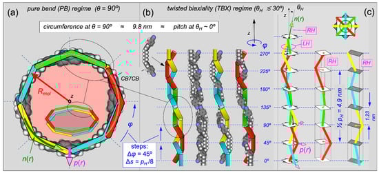 Figure 5. Realization of the polygon chain model for discrete molecules, modeling CB7CB by bent rods. Oligomeric chains are formed in both the PB and TBX regimes by the brickwork tiling of half molecules, with a repeat distance indicated by the blue dashed lines, corresponding to the short-range periodicity observed in diffuse, non-resonant X-ray scattering (Supplementary Figures S11 and S13). Each segment contains a pair of half-molecules. This tiling is stabilized by the entropic association of molecular ends and CB7CB’s flexible center. The constraint of the bend data and the polygon chain model is that the helix pitch pH at small θH in the TBX regime is the circumference of the circle in the PB regime. Since pH at small θH is 8 segments in length, the change in φ per segment is taken to be 45° in both the PB and TBX regimes. (a) PB regime showing the brickwork tiling of molecules as in Figure 3c: two chains of 45° bent molecules (red-green, yellow-cyan) forming eight segments of half-molecule pairs, with angular bend jumps of Δφ = 45° between each pair, and a Δφ = 45° phase difference in the orientation of the two chains. The small inset shows an oblique view of the packing structure. (b,c) Oligomeric chain structure showing bent-rod and molecular models of the brickwork tiling in the TBX regime: two chains of 45° bent molecules (red-green, yellow-cyan) forming eight segments of half-molecule pairs, with angular biaxial twist jumps of Δφ = 45° between each pair, and a Δφ = 45° phase difference in the orientation of the two chains. The two right-handed (RH) chains associate to form a left-handed (LH) double helix. (c) For uniaxial half-molecules, the optical polarizability of a given segment can be obtained geometrically. The optical cone angle is θH ~ 10° for the structure drawn, the case where the molecular planes are untilted.