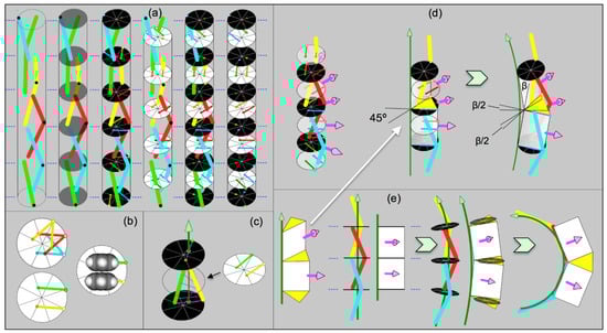 Figure 6. Representation of the TBX regime oligomeric chain structure for θH ~ 0, i.e., with n(z) parallel to z. (a) White circles show the projections onto the x-y plane of half-molecules in each segment, and the black circles the projections of half-molecules on to the interfaces between segments. (b) The planes of the 45° bent molecules are tilted from z by an angle (~10°) such that the half-molecule projections on the x-y plane are separated by Δφ = 45°, matching the reorientation in successive segments (cyan, red, yellow). This results in parallel chain projections within the segments (yellow, green). This drawing is proportioned with respect to the diameter of the chains according to the molecular volume of 0.76 nm3. The segments are 1.23 nm along z and 0.88 nm in diameter, that of the black and white circles. The phenyl ring profiles are on the same scale. (c) When biaxial optical polarizabilities with parallel projection are added, they give an untilted biaxial average (θH ~ 0). (d,e) Mating of the polygon chain model with the brickwork oligomeric chain. The projections of the half-molecules onto an interface form a 45° angle that matches that of the yellow triangles in Figure 4. If the oligomeric chain is bent, its black disc, representing the interface between two segments, tilts but remains parallel to the yellow triangle. Thus, in the oligomeric chain, even at small θH, the condition qHcosθH = 1/Rmol is enforced, keeping BH in Figure 3a on “the line”.