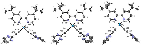 Three crystallographically unique complexes of tbpyPt(C2pym)2 in the structure of tbpyPt(C2pym)2 · 0.25(Et2O), with displacement ellipsoids shown at 50% probability levels.