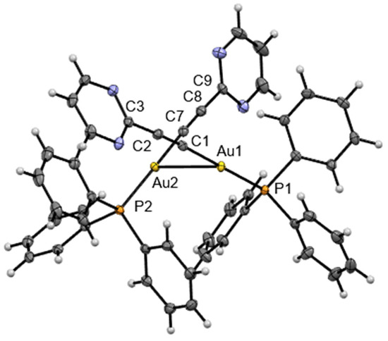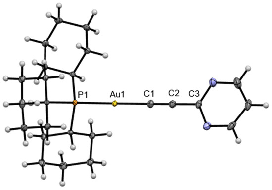 The structure of the dinuclear Ph3PAuC2pym complex is shown in Figure 4. The Au–Au distance of 3.0722(2) Å is well within the range typically considered for an aurophilic bonding interaction [31], leading to our interpretation of Ph3PAuC2pym as a dinuclear complex. All the atoms of the complex are crystallographically unique. Aurophilic interactions are common among Ph3PAu complexes, though to our knowledge, there are only two examples in the CSD where aurophilic bonding occurs between Ph3P–Au–C≡C fragments: bis[(thiphen-2-yl)ethynyl]-bis(triphenylphosphine)-di-gold (CSD refcode VULBIQ, Au–Au = 3.144 Å, [32]) and bis(μ2-penta-1,4-diyn-3-one)-tetrakis(triphenylphosphine)-tetra-gold (CSD refcode XIKWOF, Au–Au = 2.983 Å, [33]). The Ph3PAuC2pym complex has similar features about its Au centers to those other multinuclear complexes, namely approximately linear P–Au–C angles of 179.33(9)° and 173.11(9)°, Au–P distances of 2.2790(8) Å and 2.2788(7) Å, and Au–C distances of 1.998(3) Å and 1.996(3) Å.