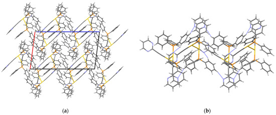 The Cy3PAuC2pym complex crystallized as a mononuclear gold complex (Figure 6) with one unique complex in the asymmetric unit. It exhibits similar features of linear P–Au–alkyne connectivity (P–Au–C angle of 176.36(4)°, Au–P distance of 2.2936(4) Å, and Au–C distance of 2.0044(16) Å) to other Cy3PAu complexes [21]. The use of 2-ethynylpyrimidine in the present study is again unique in the structural literature for Cy3PAu complexes. Here, it again enables the formation of C–H···N interactions from one pyrimidyl group of a complex to one of the pyrimidyl nitrogen atoms of a neighboring complex, thereby creating chains along the b-axis (Figure 7a). The PCy3 groups of neighboring chains are then positioned for localized complementary packing, which again limits the solvent-accessible void space (Figure 7b). Both of these features bear some similarity to what occurs in the (2-(4′-pyridyl)ethynyl)-(tris(cyclohexyl)phosphine)–gold complex (CSD refcode MUPGUZ, [21]), albeit with a generally shorter C···N distance across the C–H···N interactions of Cy3PAuC2pym (3.562(2) Å with C–H···N of 151.2° compared to 3.916(7) Å with C–H···N of 172.6°).