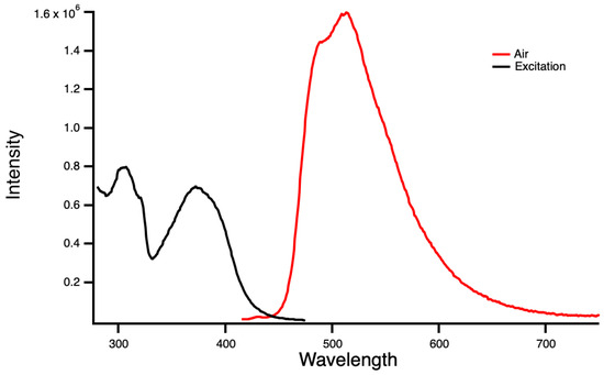 The UV-Vis spectra of tbpyPt(C2pym)2 contain transitions analogous to previously reported compounds of the form tbpyPt(C2R)2 (Supplementary Materials). The low-energy band (λmax = 377 nm) was assigned as a charge-transfer transition based on previously reported Pt(II) alkynyl compounds [4]. Lu et al. reported that this band is blue-shifted in CH2Cl2 when electron withdrawing groups are appended on the acetylide substituents, as indicated by the comparison of tbpyPt(C22-thio)2 (where HC22-thio = 2-ethynylthiophene), which has a λmax = 410, and the more electron-deficient tbpyPt(C2C6F5)2, which has a λmax = 381 nm [4]. The emission λmax of tbpyPt(C2pym)2 at 512 nm (Figure 8) is blue-shifted relative to the previously reported tbpyPt(C22-py)2, namely due to the -C2pym ligand being more electron-deficient than the -C22-py ligand. The emission spectra of tbpyPt(C2pym) are unaffected by the presence of oxygen, unlike the R3PAu(C2pym) species (vide infra).