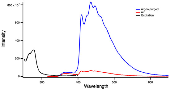 Regarding the Au(I) compounds, the UV-Vis spectra of both species (Supplementary Materials) show a low-energy feature (λmax = 275 nm) assigned to an intraligand [π → π* (C≡C)] transition based on the assignment for the previously synthesized Ph3PAu(C24-py) complex (where HC24-py = 4-ethynylpyridine) [34]. The higher-energy transitions were tentatively assigned to phosphine-centered intraligand (IL) transitions because these features are also observed in the precursor complexes, e.g., Ph3PAuCl [35,36,37,38]. The emission spectra of Ph3PAuC2pym (Supplementary Materials) and Cy3PAuC2pym (Figure 9) are similarly structured with an emission λmax = 434 nm for Ph3PAuC2pym and emission λmax = 435 nm for Cy3PAuC2pym. In both Au(I) species, there is approximately a 10-fold increase in emission intensity upon purging with argon.