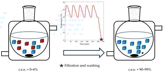 Despite significant advancements in the understanding and practical applications of these methodologies, a comprehensive quantitative demonstration of the experimental yield of these processes, particularly TCID, necessitates further investigation. While reaching crystal enantiomeric excess (c.e.e.) of >95% has been reported with various systems, the remaining dissolved solute at the end of the TCID process is one drawback to greater mass yields. This could be overcome by performing a large cooling step at the end of TCID, based on the SOAT method, to minimize the solubility of the solute and therefore allowing it to crystallize further, increasing the final yield without significantly increasing the total process time (Figure 1). If the cooling rate does not promote primary nucleation, which would allow equal opportunity for the undesired enantiomer to grow, the c.e.e. should not be affected significantly, and the final yield of the solids should be optimized. Secondary nucleation, on the other hand, would enhance the overall c.e.e. by favoring the crystal growth of the major enantiomer. This simple cooling technique has been demonstrated by Pálovics et al. and Hosseinalipour et al.; however, neither team demonstrated favorable experimental mass yields [,].