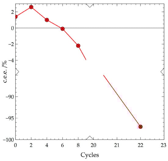 Evidence of chiral flipping: TCID with c.e.e0 = +1.4% ending with −97% c.e.e. over 22 cycles. The x and y axes are broken to magnify the initial inversion of deracemization. Data points are connected by a line as a guide for the eyes.