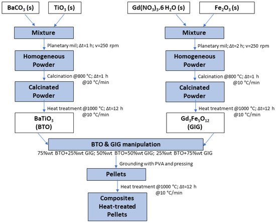 This work differed from the preceding one [18] in the thermal cycle given to the powders obtained from the solid-state reaction: in the current work, the heat treatment of the pellet samples was performed via a single-step sintering procedure, whereas the previous study involved a two-step sintering procedure. The scheme of the composites’ experimental procedure is presented in Figure 1, while Table 1 summarizes the composites’ initial composition from the BTO and GIG mixtures.