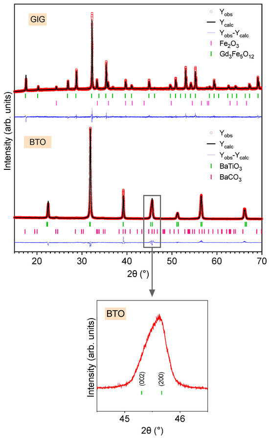 Rietveld refinement of the room temperature diffractogram from the powder samples GIG and BTO. The bottom figure shows an inset graphic of the BTO sample in the 2ϴ range of 44.5–46.5°.