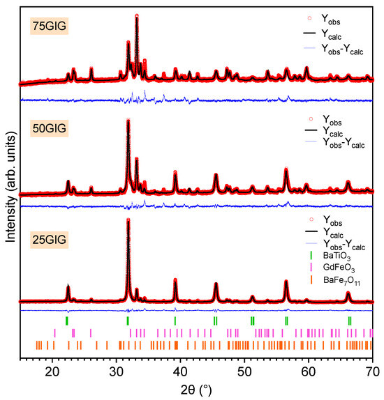 Figure 3 shows the room temperature diffractograms of the composite powder samples. Besides the BaTiO3 tetragonal phase, the composite samples revealed the presence of two additional crystalline phases, namely, GdFeO3 (ICDD pattern 04-015-5491) and BaFe7O12 (ICDD pattern 04-002-1982). While the base GIG powder was composed of Fe2O3 and Gd3Fe5O12, the heat treatment performed at 1000 °C during the sintering step promoted the formation of these two new phases in the composite samples. As shown in Table 3, the weight percentage of the GdFeO3 perovskite structure increases with the addition of GIG to the composites. For the sample with 25% GIG, the calculated wt% of GdFeO3 was around 15% and the diffractogram showed some low-intensity peaks related to the BaFe7O12 phase. For the 50GIG sample, the amount of GdFeO3 increases up to 33 wt%, and for the sample with 75% GIG, it became the major crystal phase with 55 wt%.