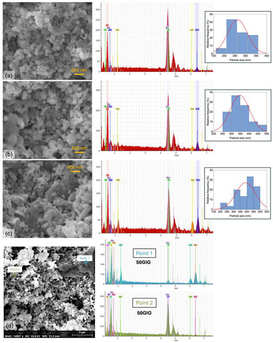 SEM micrography, grain size distribution, and EDS area analysis of the cross-section of the samples, with a magnification of 30 k×: (a) 25 wt% GIG (25GIG), (b) 50 wt% GIG (50GIG), and (c) 75 wt% GIG (75GIG). (d) EDS point analysis of the 50 wt% GIG composite.