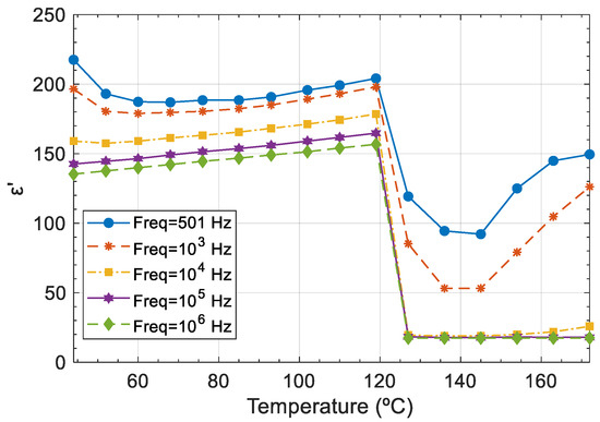 Dependence of the dielectric constant, ε′, on the temperature, at frequencies from 501 Hz to 106 Hz, for the BTO sample.