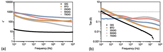(a) Dielectric constant, ε′, and (b) Tan (δ) as a function of frequency for GIG, BTO, and composites with compositions of 25 wt% GIG (25GIG), 50 wt% (50GIG), and 75 wt% (75GIG).