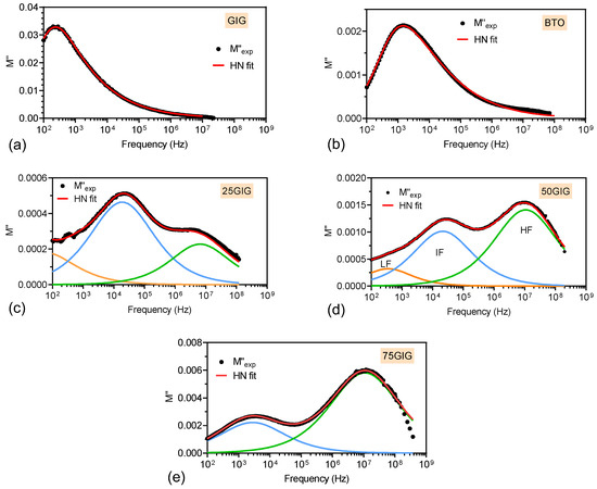 Dependence of the imaginary part of the electric Modulus, M″, on the frequency and the fit according to the simulation using the Havriliak–Negami (HN) model (red curve) for (a) GIG, (b) BTO, and composites with (c) 25 wt% of GIG, (d) 50 wt% of GIG, and (e) 75 wt% of GIG.