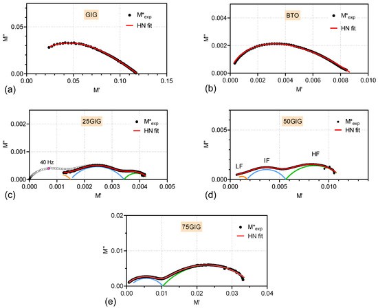 Nyquist plot, M″ vs. M′, and the fit according to the simulation using the Havriliak–Negami (HN) model (red curve) for (a) GIG, (b) BTO, and composites (c) 25GIG, (d) 50GIG, and (e) 75GIG.
