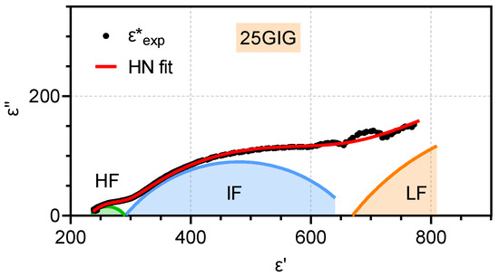 Cole–Cole plot for composite of 25 wt% of GIG and the adjustment according to the simulation using the Havriliak–Negami (HN) model (red curve), showing three relaxation processes.