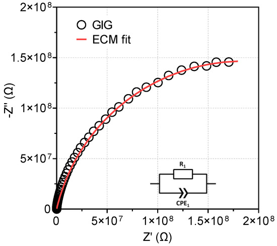 Nyquist plot, −Z″ vs. Z′, for the GIG sample at room temperature. The inset of the graphic shows the equivalent circuit model (ECM) used to fit the data.