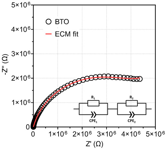 Nyquist plot, −Z″ vs. Z′, for the BTO sample at room temperature. The inset of the graphic shows the equivalent circuit model (ECM) used to fit the data.