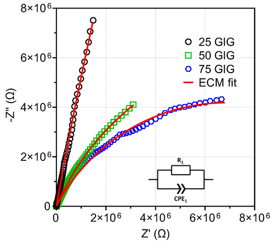 Similarly to the GIG sample (Figure 10), the impedance of the composite samples shows an incomplete semicircle (Figure 13) that is well-fitted to an electrical circuit consisting of a resistor (R1) in parallel with a constant phase element (CPE1). As shown in Table 5, the conductivity of the 75GIG and 50GIG samples is very close, at 2.54 × 10−6 S/m and 1.84 × 10−6 S/m, respectively. Conversely, for the 25GIG sample, the conductivity is two orders of magnitude lower, at 8.36 × 10−8 S/m. When judging solely on the capacitance values (around 10−10 F), one cannot accurately conclude on the assignment of this contribution. Although they resemble the typical values found for grain boundaries (10−11–10−8 F), additional information such as impedance measurements as a function of temperature is required to confirm this assumption.