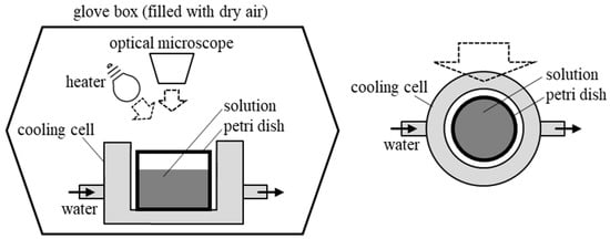 Figure 1 shows a schematic diagram of the experimental apparatus. The glycine-saturated aqueous solution was prepared at 308 K containing L-leucine (1.0 × 10−4 mol/mL-H2O). During the experiment, a petri dish (29 mm diameter) was cooled with 288 K cooling water (ΔT = 20 K) from a thermostat bath. An incandescent bulb with IW = 50 W was used as a heater. Multiple experiments were performed with different cooling and heating times and air conditions. Experimental conditions are summarized in Table 1. In Run 1, an air–solution interface was generated by feeding the solution into a petri dish in a glove box filled with dry air. After cooling for 20 min, the solution was heated near the interface. The heating started, and 20 min later, the heater was turned off and the solution was shaken to recrystallize. From Run 2 to Run 5, the heating time and the operation to recrystallize are different, respectively. From Run 6 to Run 8, experiments were carried out in ambient air, with shorter cooling times and different heating times. The heater and a petri dish were placed in the same position throughout all experiments. The amount of solution fed was approximately 2 g. The crystalline particles of glycine precipitated at the air–solution interface in each batch were observed with the optical microscope.
