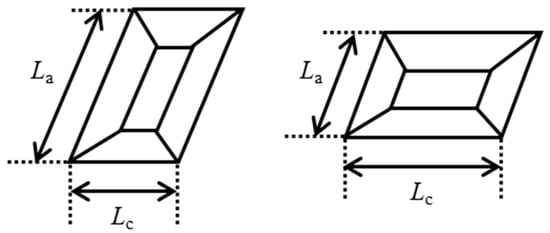 In this study, the number of crystals per unit area is defined as nucleation density DN (crystals/mm2), and DN (crystals/mm2) is used to evaluate the number of crystals at the air–solution template interface. The presence of L-leucine results in pyramidal glycine crystals whose basal plane faces are exposed to air; therefore, the crystallographic axes must be considered [24]. The length along the a axis La and the length along the c axis Lc were measured considering the crystallographic axis, as shown in Figure 2, to evaluate the average size and size distribution of the precipitated crystalline particles.