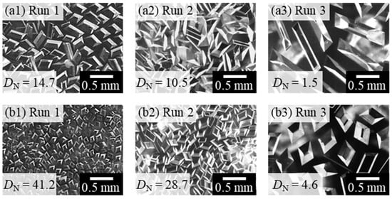 The solution near the interface, where crystals precipitated at the air–solution interface were dissolved by heating the interface, should not only have a temperature gradient but also a concentration gradient. If only the solution near the interface has a high concentration, only the nucleation field can be highly supersaturated, which can affect the number of crystals. Therefore, the local supersaturation was changed by the template reset operation, in which crystals precipitated at the interface by cooling were dissolved by heating the interface. Then, the cooling again, and the crystalline particles precipitated again at the interface, and the effect on the number of crystals were investigated. During the template reset operation, the bulk solution was simultaneously cooled as usual (ΔT = 20). For each experimental condition, the nucleation density DN (crystals/mm2) of the precipitated crystalline particles before and after the template reset operation was determined, and the results are summarized in Table 2. Optical photomicrographs of the glycine crystals precipitated before and after the template reset under the conditions of Run 1 to Run 3 are also shown in Figure 5.