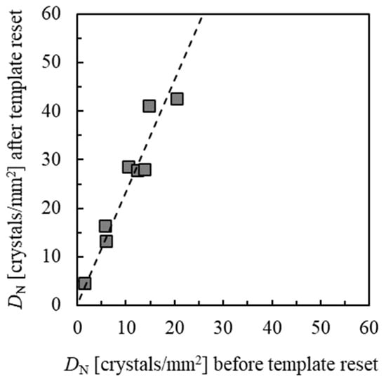 Table 2 and Figure 5 show that the template reset operation at the template interface, which prevents new nucleation, increased DN compared to before the operation. This suggests that the number of crystals increased due to the local supersaturation of the solution near the interface, the nucleation field, by the template reset operation, in which the crystals precipitated at the interface are dissolved and then re-precipitated. Observation of crystalline particles precipitated by template reset under various conditions suggested the possibility of a relation between DN before and after the template reset operation. The nucleation density DN (crystals/mm2) results in Table 2 are plotted on the chart shown in Figure 6 to investigate the relation between the number of crystals before and after the template reset operation.
