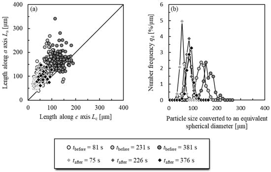 Comparing the crystal appearance before and after the template reset operation in Figure 5, the increase in the number of crystals also affects the particle size of the crystalline particles. To evaluate the changes in the crystalline particles’ properties before and after the template reset operation, the changes in length La and Lc were investigated at three sampling times, each before and after the template reset operation in Run 1. The lengths La and Lc were measured over 100 at each sampling time, with the first cooling time before the template reset operation as tbefore ● and the subsequent cooling time after the operation as tafter ◆, and the results are shown in Figure 7a. Based on the a axis, c axis, and acute angle θ = 68.4° of the glycine crystal, the particle size was estimated as an equivalent spherical diameter, and the particle size distribution at each sampling time is shown in Figure 7b.