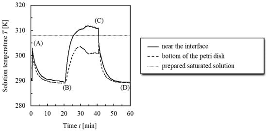 From Figure 8, the solution temperature decreased immediately after the prepared saturated solution was fed into the petri dish (A). There was no significant difference in temperature between the solution near the interface and the solution at the bottom of the petri dish. About 10 min after starting to cool, the solution cooled to around the temperature of the cooling water. Just before heating was started, the solution at the bottom of the petri dish was 289.3 K and the solution near the interface was 289.7 K (B). When heating was started above the interface, the solution temperature increased (B). In particular, the temperature of the solution near the interface immediately increased and exceeded 308 K, the saturation temperature of the prepared saturated solution. At the end of heating, the temperature of the solution at the bottom of the petri dish was 300.6 K, while that near the interface was 310.2 K, a difference of 9.6 K (C). The temperature of the solution near the interface after template reset was 2.2 K higher than the saturation temperature of the prepared saturated solution. From these results, it is clear that a temperature gradient was generated near the interface, and considering the phenomenon of dissolution of the crystals, a concentration gradient was also generated. In the end, the solution at the bottom of the petri dish and the solution near the interface were cooled to around the cooling water temperature (D).