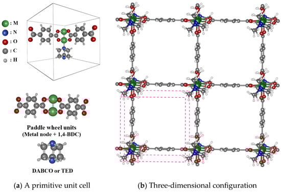 The configuration of (a) a primitive unit cell and (b) a three-dimensional view of M2(BDC)2(DABCO) or M(DABCO).