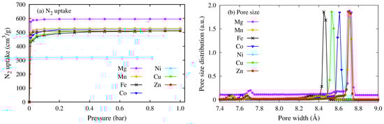 Firstly, we discuss the porosity and surface area of the M(DABCO) frameworks. The N2 sorption isotherms in M(DABCO) and their pore-size distribution (PSD) are shown in Figure 2a and Figure 2b, respectively. These N2 sorption isotherms indicate the type-I adsorption isotherms, similar to the N2 isotherm on Zn(BDC)(DABCO)0.5 [] and Co(BDC)(DABCO)0.5 [] (these increased rapidly at a pressure near 0 bar and saturated at ca. 500 cm3/g). Herein, the results show that Mg(DABCO) is superior to the remaining M(DABCO) MOFs in regards to N2 adsorption.