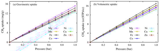 The adsorbed amount of CH4 (methane) and the adsorption isotherms of N2 (nitrogen) and CH4 in M(DABCO) were computed using grand canonical Monte Carlo (GCMC) simulation at room temperature and various pressures up to 100 bar using the RASPA code []. The GCMC simulations were performed using the μVT ensemble (constant chemical potential, volume, and temperature). First, we performed 1.5 × 105 equilibration cycles and then performed 3.5 × 105 MC steps for random insertion, random deletion, translation, or rotation of molecules (N2, CH4) in the M2(BDC)2(DABCO) box (repeated three times, with the primitive unit cell in three dimensions) to obtain the equilibrium systems.