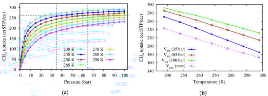 Although the results obtained for adsorption capacities, especially volumetric uptakes, of CH4 in M(DABCO) are remarkable, they have not yet reached the DOE’s standards (500 mg/g and 263 cc/cc). Therefore, we further elucidate CH4 uptakes in M(DABCO) in the temperature range from 298 K to 238 K to strengthen CH4 adsorption. Here, we only considered Mg(DABCO), which is the best candidate for CH4 storage in the M(DABCO) series. The results are shown in Figure 5a. If the packing efficiency loss of CH4 is ignored, at 238 K and 35 bar, cc/cc, which could meet the DOE target (263 cc/cc). At higher pressures (65 bar and 100 bar), the temperatures at which the reaches the DOE standard are 258 K and 268 K, respectively, showing that elevating the pressure could increase the temperature at which the volumetric uptake meets the DOE requirement. We also note that this relationship between pressure and temperature is linear (see details in Table 4). Figure 5b shows that the total CH4 uptakes (at 35 bar, 65 bar, and 100 bar) and the maximum excess CH4 uptake depend linearly on the temperature. These trends could be seen in many MOFs for methane uptakes available at 1 bar, especially for CH4 adsorbed on M(BDP) (M = Co, Fe; BDP = 1,4-benzenedipyrazolate) [].