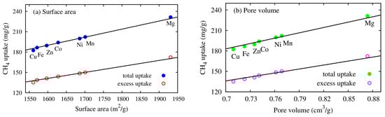 The dependence of the simulated maximum total and excess CH4 uptakes (at 298 K) on (a) surface area and (b) pore volume (solid and empty circles). Herein, solid lines denote the linear fitting with the maximum uptakes.