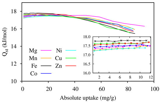 In order to elucidate the average interaction between the CH4 molecules and the M(DABCO) MOFs (CH4@M(DABCO)), the isosteric heat of adsorption () at room temperature was calculated and visualized (see Figure 7). The results reveal that the values of for CH4@M(DABCO) are about 16 to 18 kJ/mol, with the average of ≈ 17 kJ/mol. Generally, the heat of adsorption of CH4 physisorption is about 15 to 25 kJ/mol for sorbents recording the highest volumetric CH4 capacities [], and the of CH4@M(DABCO) is also within this range. Hence, we conclude that M(DABCO) is promising for CH4 storage, based on physisorption. It is also noted that at the pressures below 1 bar, the of CH4@Fe(DABCO) is also higher than that of the remaining metals, explaining the stronger CH4 adsorption on Fe(DABCO) sorbents below 1 bar (the inset of Figure 7). The relatively small difference between the adsorption heats of M(DABCO) explains the reason for the insignificant change in the volumetric CH4 adsorption capacity of M(DABCO) (Figure 4b).